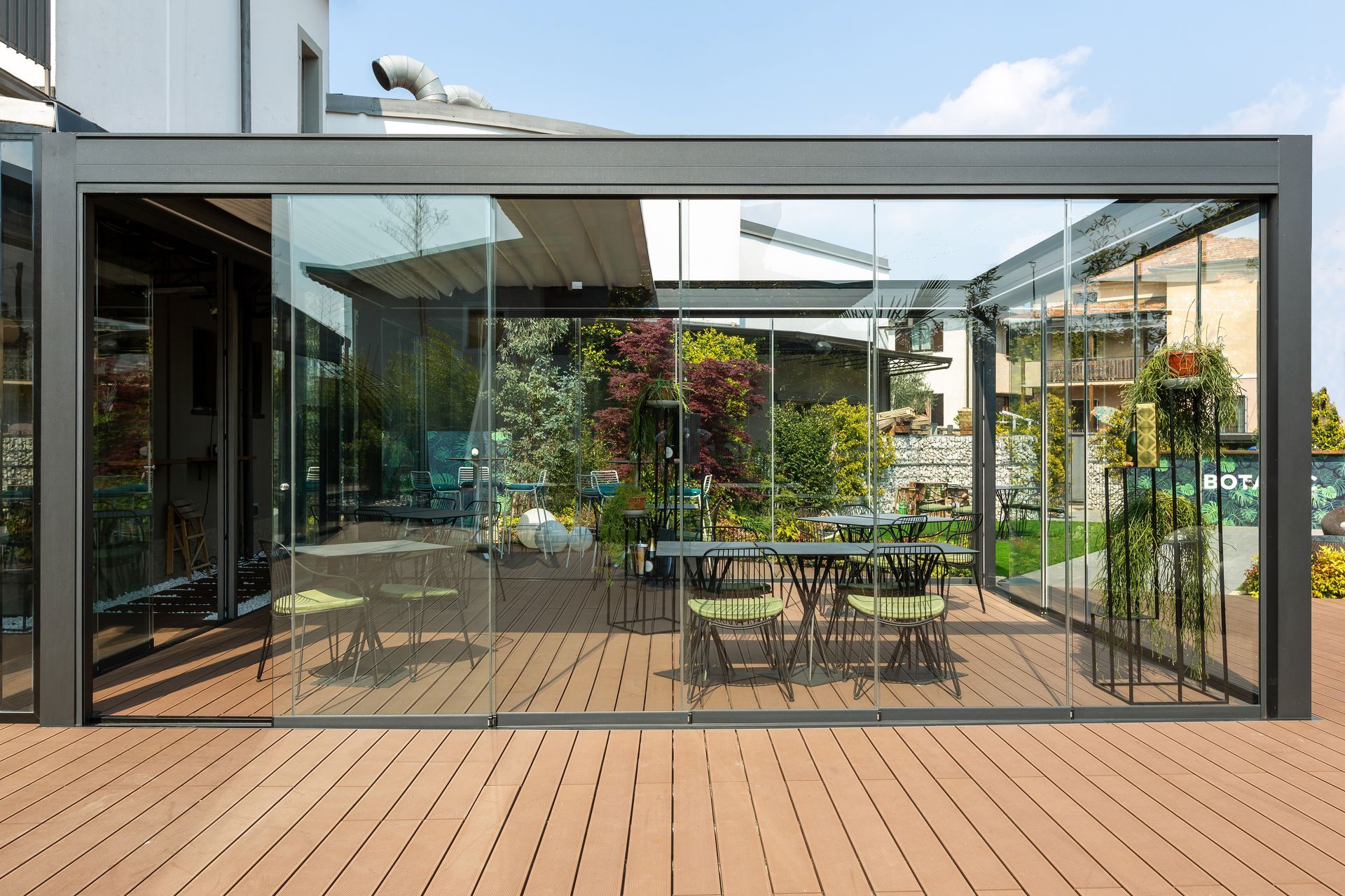 Una tenda a pergola con telo di protezione in PVC ignifugo.